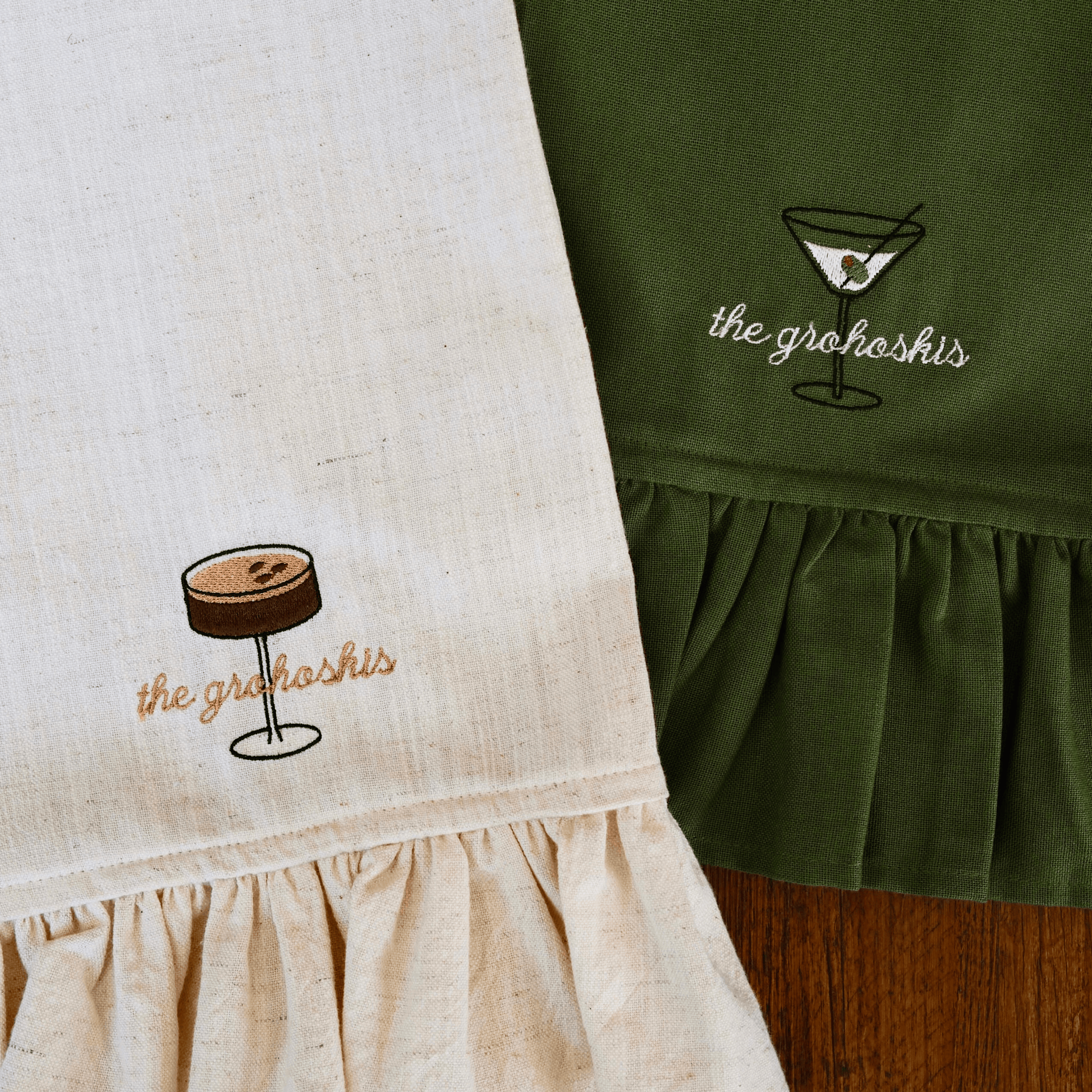 Elevate your kitchen or bar cart with this personalized ruffle tea towel. Made from a blend of high-quality woven cotton and linen, and finished with a delicate ruffle trim, it’s the perfect decorative touch for any space. Choose your favorite cocktail — from a classic martini to a spicy margarita — and personalize it with custom text of your choice.